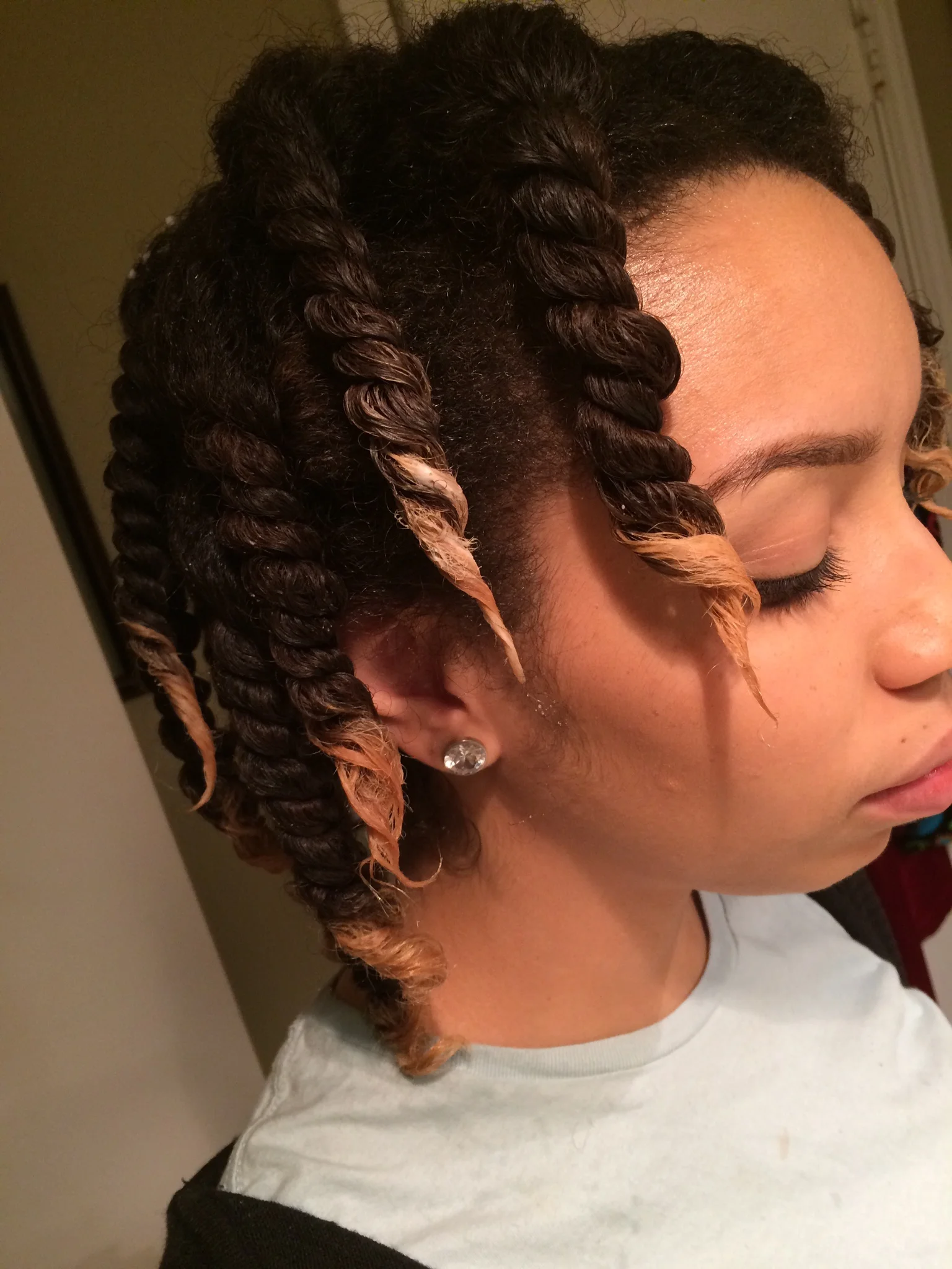 Because my hair is so thick, it gets tangled very easily. So what I like to do is take some coconut oil and a spray bottle full of water and finger detangle my hair. I grab small sections, wet the section with water, take some coconut oil, run it through my ends (mainly focusing on my roots and ends) and using my fingers I finger detangle it. I start at the ends then work my way up just so I'm not pulling on my hair too much. Once that section is finished I twist it and go onto the next. By the time my hair is finished it looks like this: