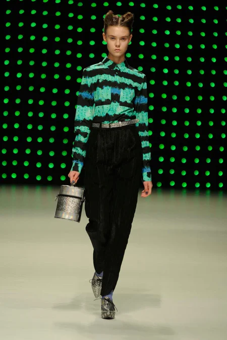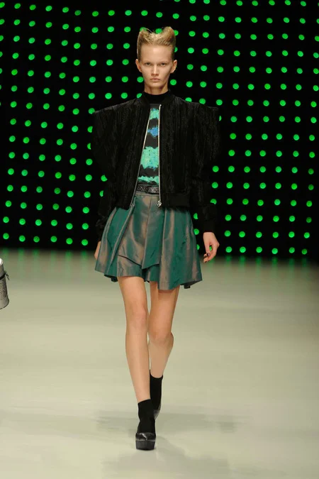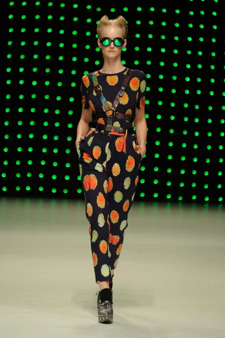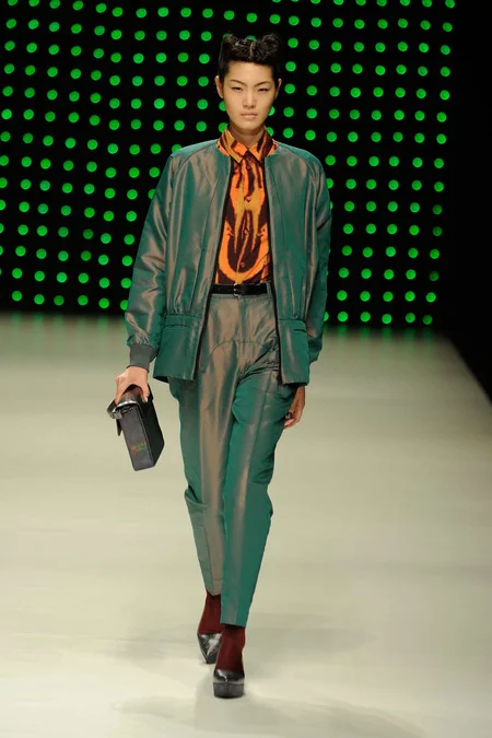 The collections concept was Utopia Paradise & Entomology(The Scientific Study of Insects). Not insects from Japan, but from a Tropical rain forest. Manly It reflects the rhinoceros beetle. You know a runway show is successful when you leave with an image stuck in your head. Watching This show gave me an image of a garden through an insects eyes. We definitely see the "Insectopia" theme with the devil-horned hair, abstract patterns, iridescent fabrics, unzipped beetle winged leather jacket, and cool futuristic dragon fly sunglasses.